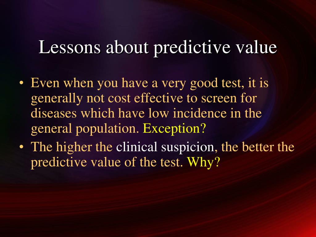 Lessons about predictive value • Even when you have a very good test, it is generally not cost effective to screen for diseases which have low incidence in the general population. Exception? • The higher the clinical suspicion, the better the predictive value of the test. Why?