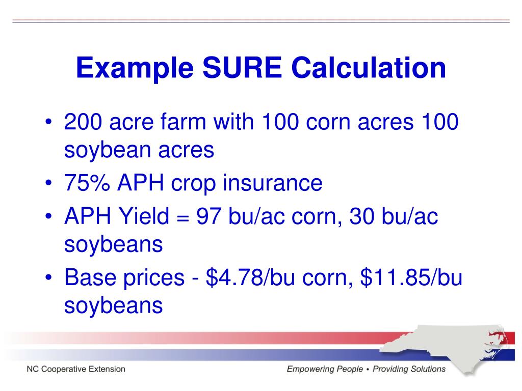 Example SURE Calculation • 200 acre farm with 100 corn acres 100 soybean acres • 75% APH crop insurance • APH Yield = 97 bu/ac corn, 30 bu/ac soybeans • Base prices - $4.78/bu corn, $11.85/bu soybeans