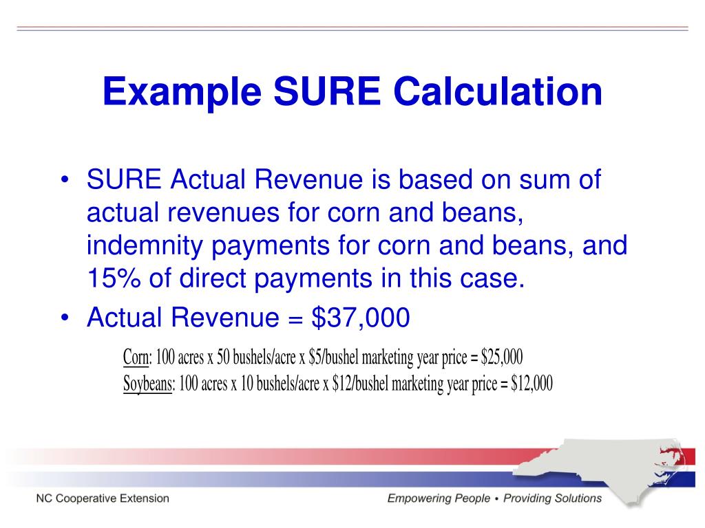 Example SURE Calculation • SURE Actual Revenue is based on sum of actual revenues for corn and beans, indemnity payments for corn and beans, and 15% of direct payments in this case. • Actual Revenue = $37,000