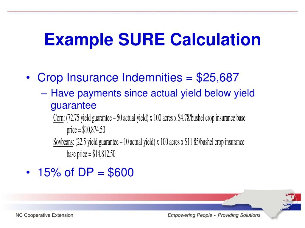 Example SURE Calculation • Crop Insurance Indemnities = $25,687 • Have payments since actual yield below yield guarantee • 15% of DP = $600