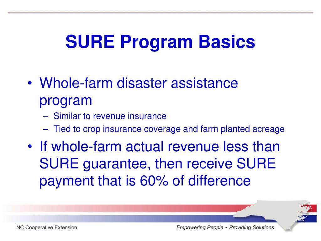 SURE Program Basics • Whole-farm disaster assistance program • Similar to revenue insurance • Tied to crop insurance coverage and farm planted acreage • If whole-farm actual revenue less than SURE guarantee, then receive SURE payment that is 60% of difference