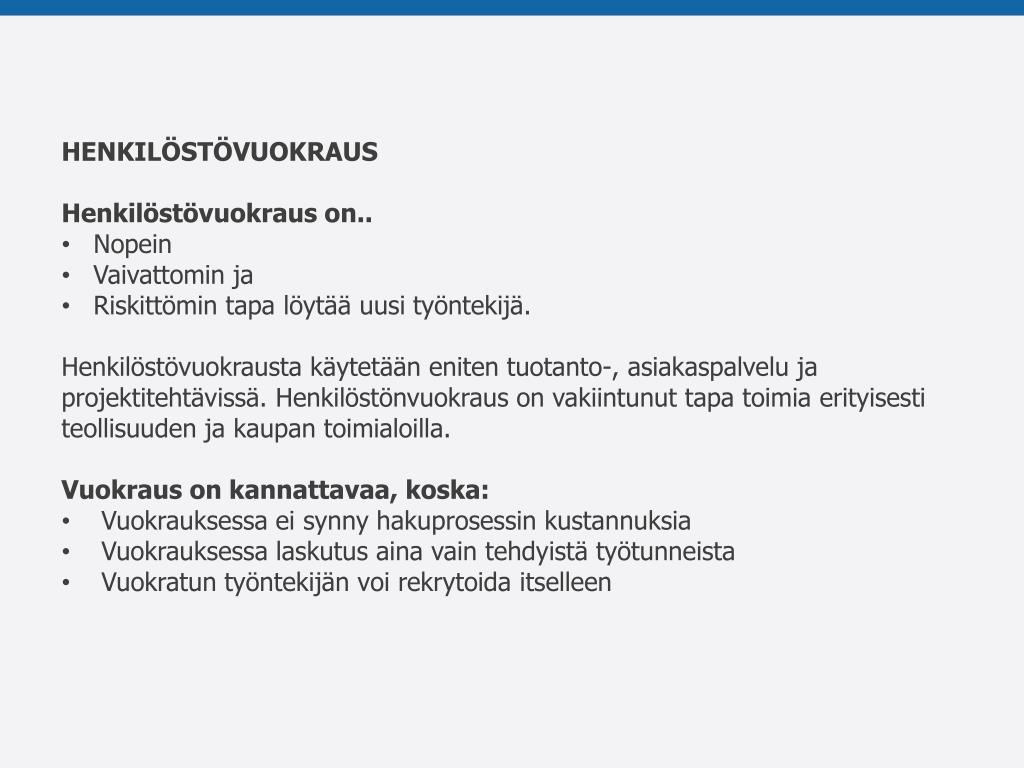 HENKILÖSTÖVUOKRAUS • Henkilöstövuokraus on.. • Nopein • Vaivattomin ja • Riskittömin tapa löytää uusi työntekijä. • Henkilöstövuokrausta käytetään eniten tuotanto-, asiakaspalvelu ja projektitehtävissä. Henkilöstönvuokraus on vakiintunut tapa toimia erityisesti teollisuuden ja kaupan toimialoilla. • Vuokraus on kannattavaa, koska: • Vuokrauksessa ei synny hakuprosessin kustannuksia • Vuokrauksessa laskutus aina vain tehdyistä työtunneista • Vuokratun työntekijän voi rekrytoida itselleen