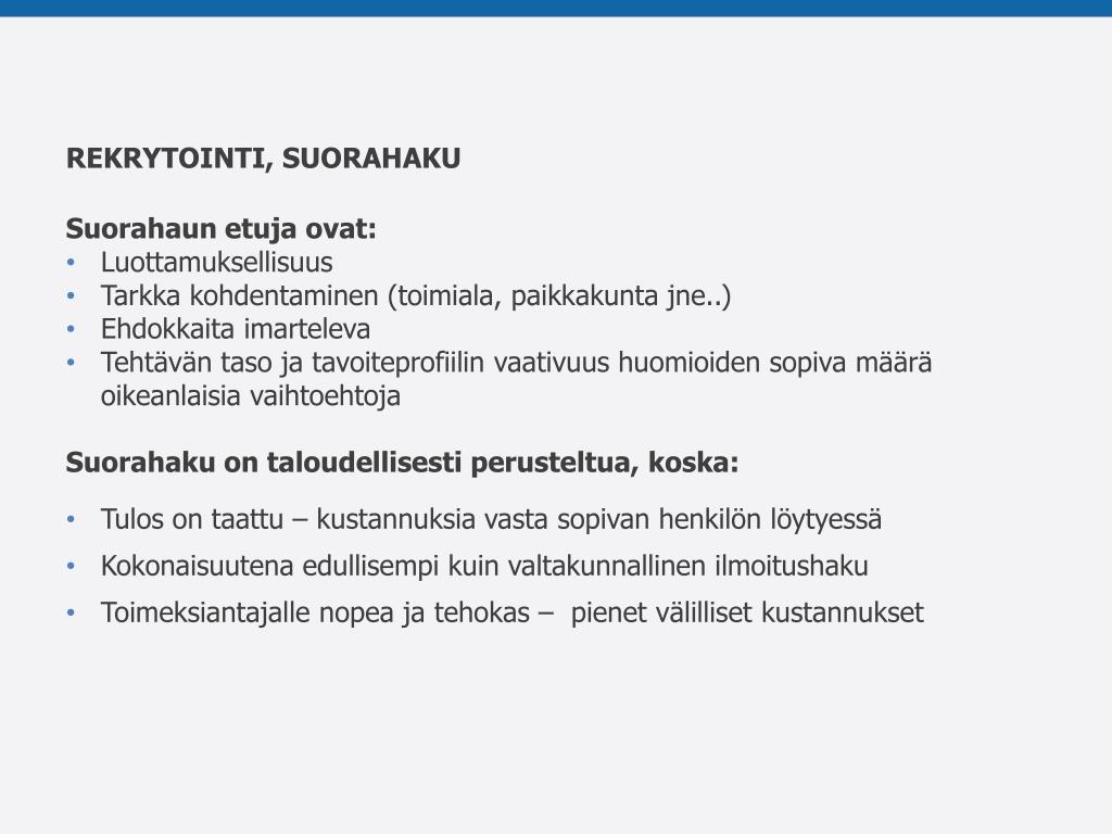 REKRYTOINTI, SUORAHAKU • Suorahaun etuja ovat: • Luottamuksellisuus • Tarkka kohdentaminen (toimiala, paikkakunta jne..) • Ehdokkaita imarteleva • Tehtävän taso ja tavoiteprofiilin vaativuus huomioiden sopiva määrä oikeanlaisia vaihtoehtoja • Suorahaku on taloudellisesti perusteltua, koska: • Tulos on taattu – kustannuksia vasta sopivan henkilön löytyessä • Kokonaisuutena edullisempi kuin valtakunnallinen ilmoitushaku • Toimeksiantajalle nopea ja tehokas – pienet välilliset kustannukset