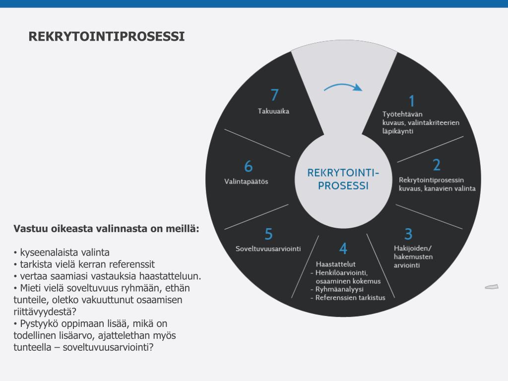 REKRYTOINTIPROSESSI • Vastuu oikeasta valinnasta on meillä: • kyseenalaista valinta • tarkista vielä kerran referenssit • vertaa saamiasi vastauksia haastatteluun. • Mieti vielä soveltuvuus ryhmään, ethän tunteile, oletko vakuuttunut osaamisen riittävyydestä? • Pystyykö oppimaan lisää, mikä on todellinen lisäarvo, ajattelethan myös tunteella – soveltuvuusarviointi?