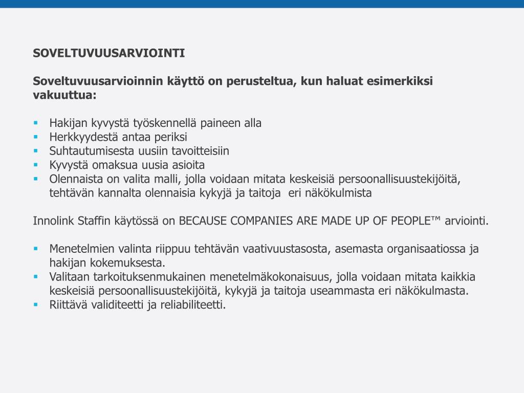 SOVELTUVUUSARVIOINTI • Soveltuvuusarvioinnin käyttö on perusteltua, kun haluat esimerkiksi vakuuttua: • Hakijan kyvystä työskennellä paineen alla • Herkkyydestä antaa periksi • Suhtautumisesta uusiin tavoitteisiin • Kyvystä omaksua uusia asioita • Olennaista on valita malli, jolla voidaan mitata keskeisiä persoonallisuustekijöitä, tehtävän kannalta olennaisia kykyjä ja taitoja eri näkökulmista • Innolink Staffin käytössä on BECAUSE COMPANIES ARE MADE UP OF PEOPLE™ arviointi. • Menetelmien valinta riippuu tehtävän vaativuustasosta, asemasta organisaatiossa ja hakijan kokemuksesta. • Valitaan tarkoituksenmukainen menetelmäkokonaisuus, jolla voidaan mitata kaikkia keskeisiä persoonallisuustekijöitä, kykyjä ja taitoja useammasta eri näkökulmasta. • Riittävä validiteetti ja reliabiliteetti.