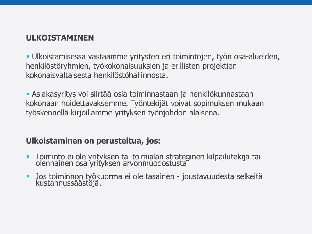 ULKOISTAMINEN • Ulkoistamisessa vastaamme yritysten eri toimintojen, työn osa-alueiden, henkilöstöryhmien, työkokonaisuuksien ja erillisten projektien kokonaisvaltaisesta henkilöstöhallinnosta. • Asiakasyritys voi siirtää osia toiminnastaan ja henkilökunnastaan kokonaan hoidettavaksemme. Työntekijät voivat sopimuksen mukaan työskennellä kirjoillamme yrityksen työnjohdon alaisena. • Ulkoistaminen on perusteltua, jos: • Toiminto ei ole yrityksen tai toimialan strateginen kilpailutekijä tai olennainen osa yrityksen arvonmuodostusta • Jos toiminnon työkuorma ei ole tasainen - joustavuudesta selkeitä kustannussäästöjä.