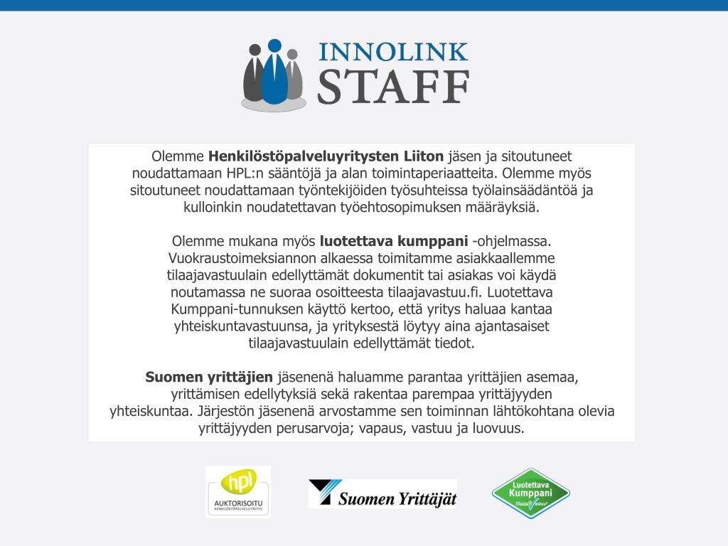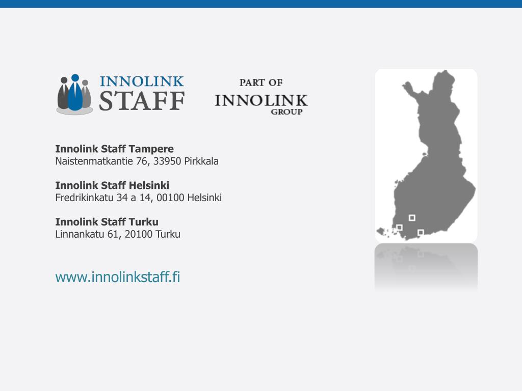Innolink StaffTampere Naistenmatkantie 76, 33950 Pirkkala Innolink StaffHelsinki Fredrikinkatu 34 a 14, 00100 Helsinki Innolink StaffTurku Linnankatu 61, 20100 Turku www.innolinkstaff.fi