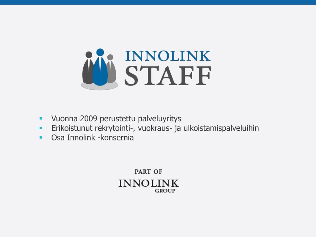 Vuonna 2009 perustettu palveluyritys • Erikoistunut rekrytointi-, vuokraus- ja ulkoistamispalveluihin • Osa Innolink -konsernia