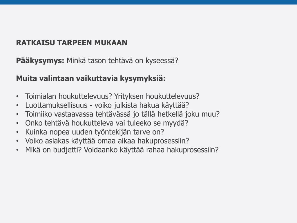 RATKAISU TARPEEN MUKAAN • Pääkysymys: Minkä tason tehtävä on kyseessä? • Muita valintaan vaikuttavia kysymyksiä: • Toimialan houkuttelevuus? Yrityksen houkuttelevuus? • Luottamuksellisuus - voiko julkista hakua käyttää? • Toimiiko vastaavassa tehtävässä jo tällä hetkellä joku muu? • Onko tehtävä houkutteleva vai tuleeko se myydä? • Kuinka nopea uuden työntekijän tarve on? • Voiko asiakas käyttää omaa aikaa hakuprosessiin? • Mikä on budjetti? Voidaanko käyttää rahaa hakuprosessiin?