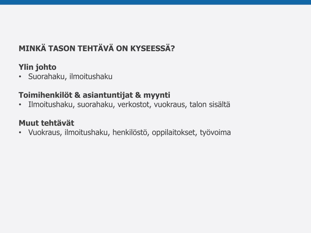 MINKÄ TASON TEHTÄVÄ ON KYSEESSÄ? • Ylin johto • Suorahaku, ilmoitushaku • Toimihenkilöt & asiantuntijat & myynti • Ilmoitushaku, suorahaku, verkostot, vuokraus, talon sisältä • Muut tehtävät • Vuokraus, ilmoitushaku, henkilöstö, oppilaitokset, työvoima
