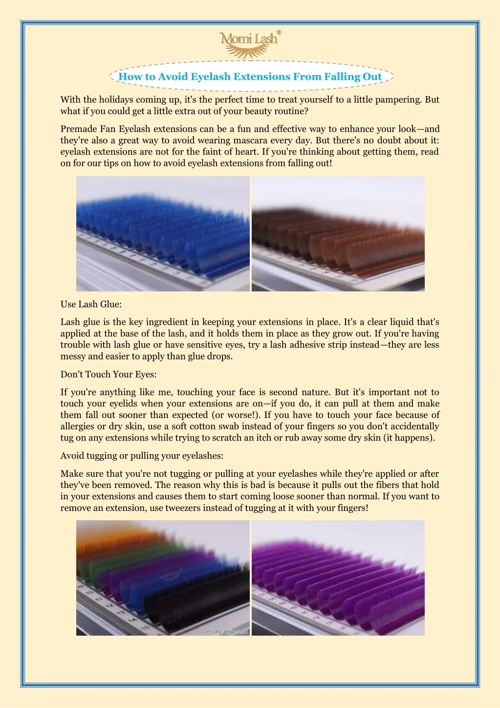 With the holidays coming up, it's the perfect time to treat yourself to a little pampering. But what if you could get a little extra out of your beauty routine?<br>Premade Fan Eyelash extensions can be a fun and effective way to enhance your looku2014and they're also a great way to avoid wearing mascara every day. But there's no doubt about it: eyelash extensions are not for the faint of heart. If you're thinking about getting them, read on for our tips on how to avoid eyelash extensions from falling out!<br><br>See more: https://momilash.com/