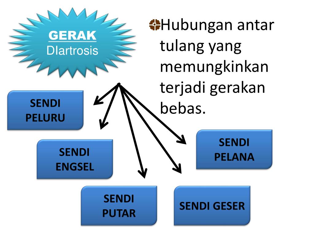 GERAK DIartrosis • Hubungan antar tulang yang memungkinkan terjadi gerakan bebas. SENDI PELURU SENDI PELANA SENDI ENGSEL SENDI PUTAR SENDI GESER
