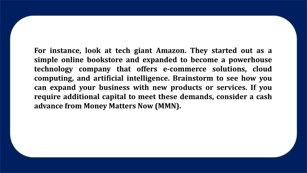 For instance, look at tech giant Amazon. They started out as a simple online bookstore and expanded to become a powerhouse technology company that offers e-commerce solutions, cloud computing, and artificial intelligence. Brainstorm to see how you can expand your business with new products or services. If you require additional capital to meet these demands, consider a cash advance from Money Matters Now (MMN).