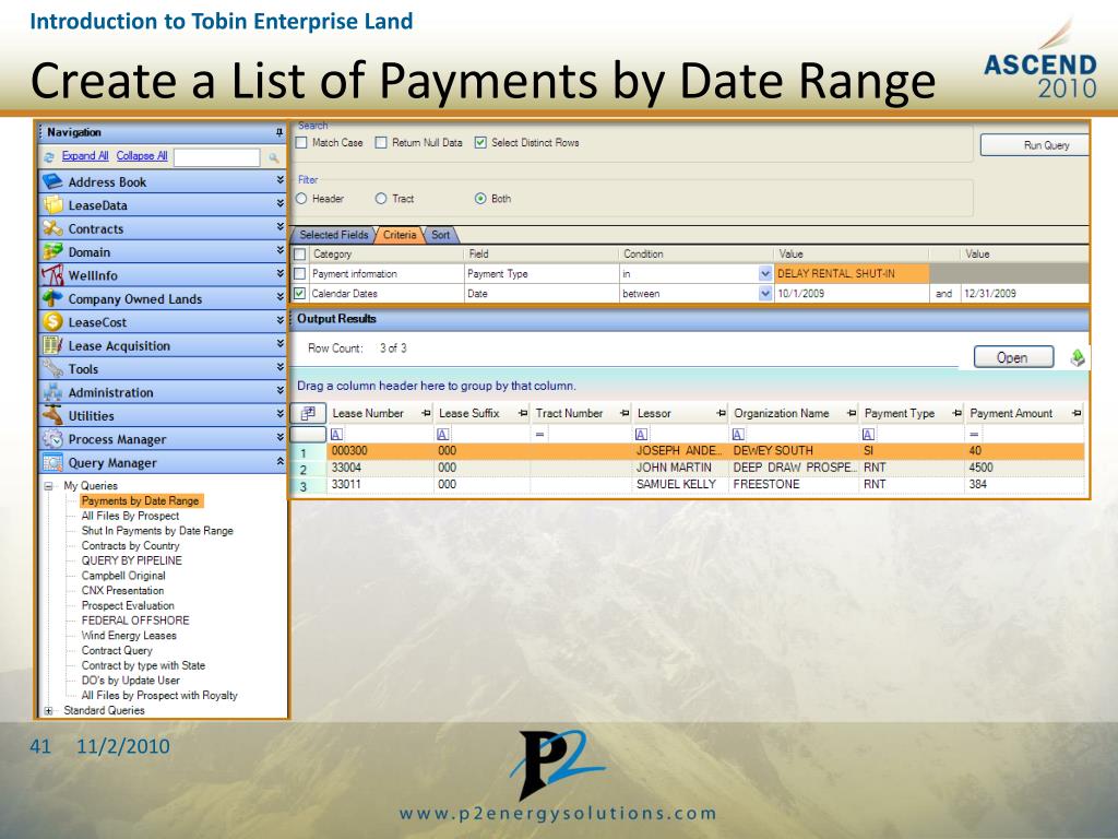 Tobin Enterprise Land Overview Ease of Use Familiar user interface Increase operational efficiencies Accurate acreage reporting Superior asset protection Lease Acquisition Maintenance Flexible Acreage Fee Property Obligations Ownership
