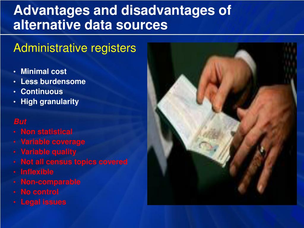 Advantages and disadvantages of alternative data sources Administrative registers • Minimal cost • Less burdensome • Continuous • High granularity But • Non statistical • Variable coverage • Variable quality • Not all census topics covered • Inflexible • Non-comparable • No control • Legal issues