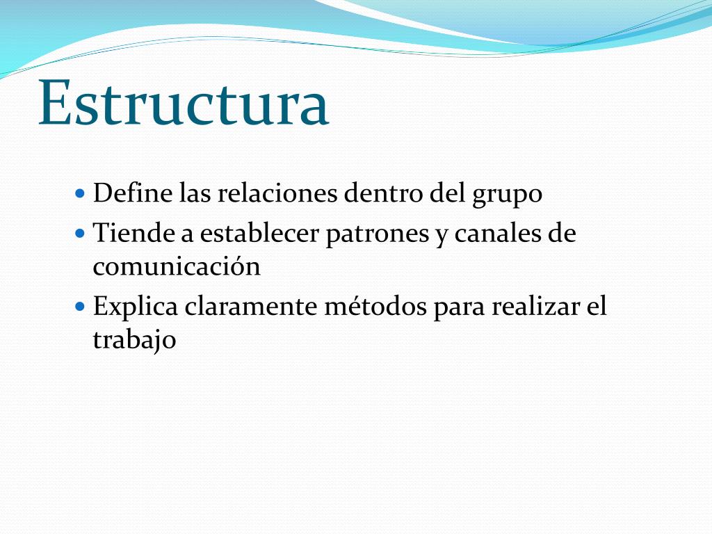 Estructura • Define las relaciones dentro del grupo • Tiende a establecer patrones y canales de comunicación • Explica claramente métodos para realizar el trabajo