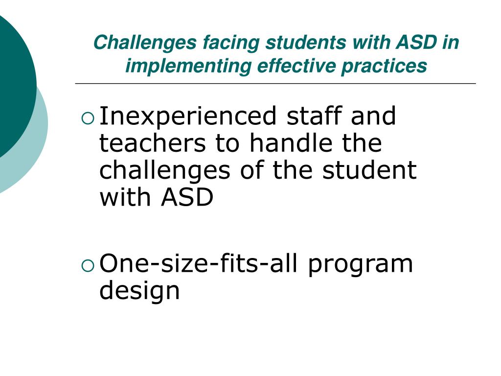 Challenges facing students with ASD in implementing effective practices • Inexperienced staff and teachers to handle the challenges of the student with ASD • One-size-fits-all program design