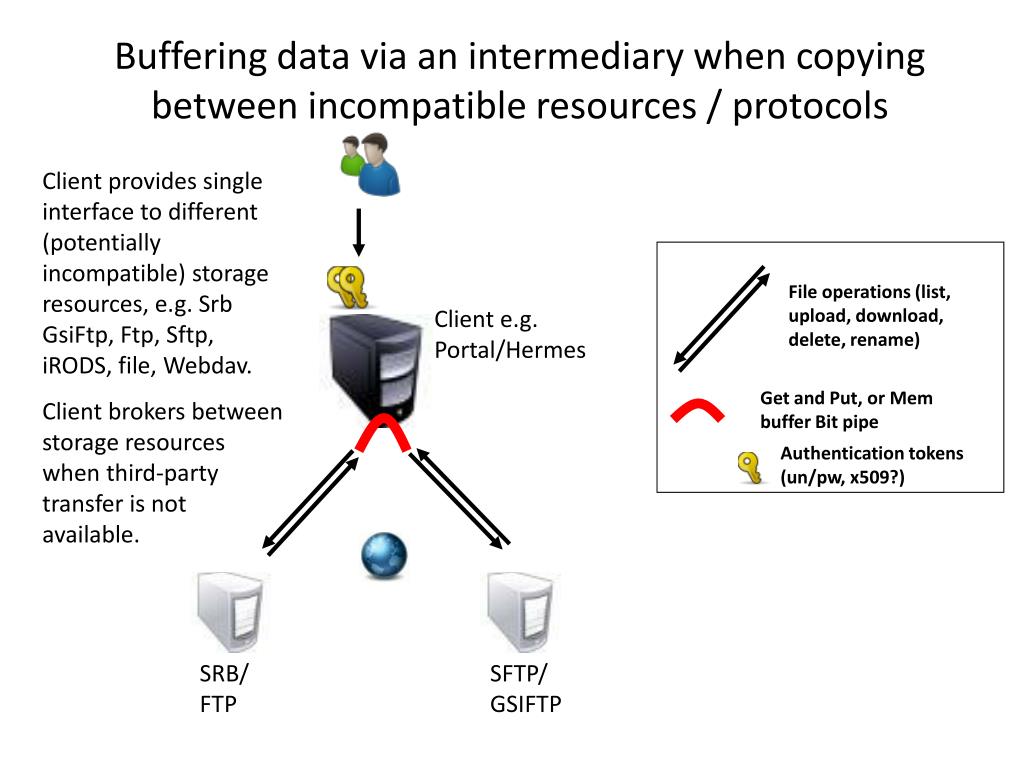 Buffering data via an intermediary when copying between incompatible resources / protocols Client provides single interface to different (potentially incompatible) storage resources, e.g. Srb GsiFtp, Ftp, Sftp, iRODS, file, Webdav. Client brokers between storage resources when third-party transfer is not available. File operations (list, upload, download, delete, rename) Client e.g. Portal/Hermes Get and Put, or Mem buffer Bit pipe Authentication tokens (un/pw, x509?) SRB/ FTP SFTP/ GSIFTP