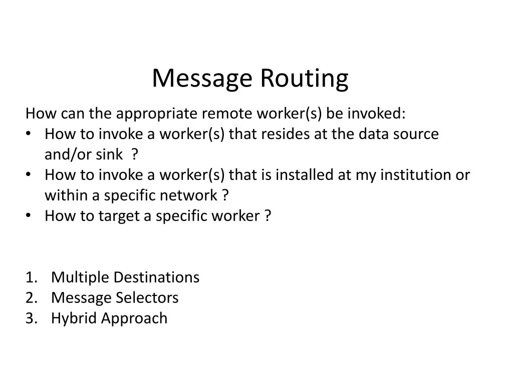 How can the appropriate remote worker(s) be invoked: • How to invoke a worker(s) that resides at the data source and/or sink ? • How to invoke a worker(s) that is installed at my institution or within a specific network ? • How to target a specific worker ? • Multiple Destinations • Message Selectors • Hybrid Approach Message Routing