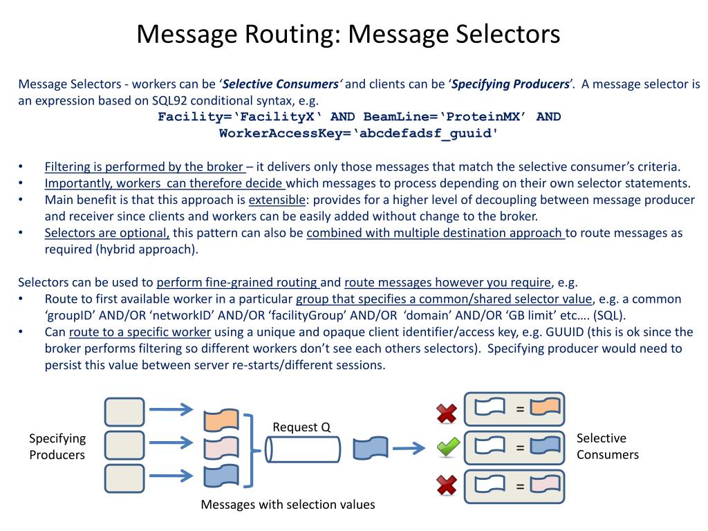Message Routing: Message Selectors • Message Selectors - workers can be ‘Selective Consumers‘ and clients can be ‘Specifying Producers’. A message selector is an expression based on SQL92 conditional syntax, e.g. • Facility=‘FacilityX‘ AND BeamLine=‘ProteinMX’ AND WorkerAccessKey=‘abcdefadsf_guuid' • Filtering is performed by the broker – it delivers only those messages that match the selective consumer’s criteria. • Importantly, workers can therefore decide which messages to process depending on their own selector statements. • Main benefit is that this approach is extensible: provides for a higher level of decoupling between message producer and receiver since clients and workers can be easily added without change to the broker. • Selectors are optional, this pattern can also be combined with multiple destination approach to route messages as required (hybrid approach). • Selectors can be used to perform fine-grained routing and route messages however you require, e.g. • Route to first available worker in a particular group that specifies a common/shared selector value, e.g. a common ‘groupID’ AND/OR ‘networkID’ AND/OR ‘facilityGroup’ AND/OR ‘domain’ AND/OR ‘GB limit’ etc…. (SQL). • Can route to a specific worker using a unique and opaque client identifier/access key, e.g. GUUID (this is ok since the broker performs filtering so different workers don’t see each others selectors). Specifying producer would need to persist this value between server re-starts/different sessions. = Request Q Selective Consumers Specifying Producers = = Messages with selection values