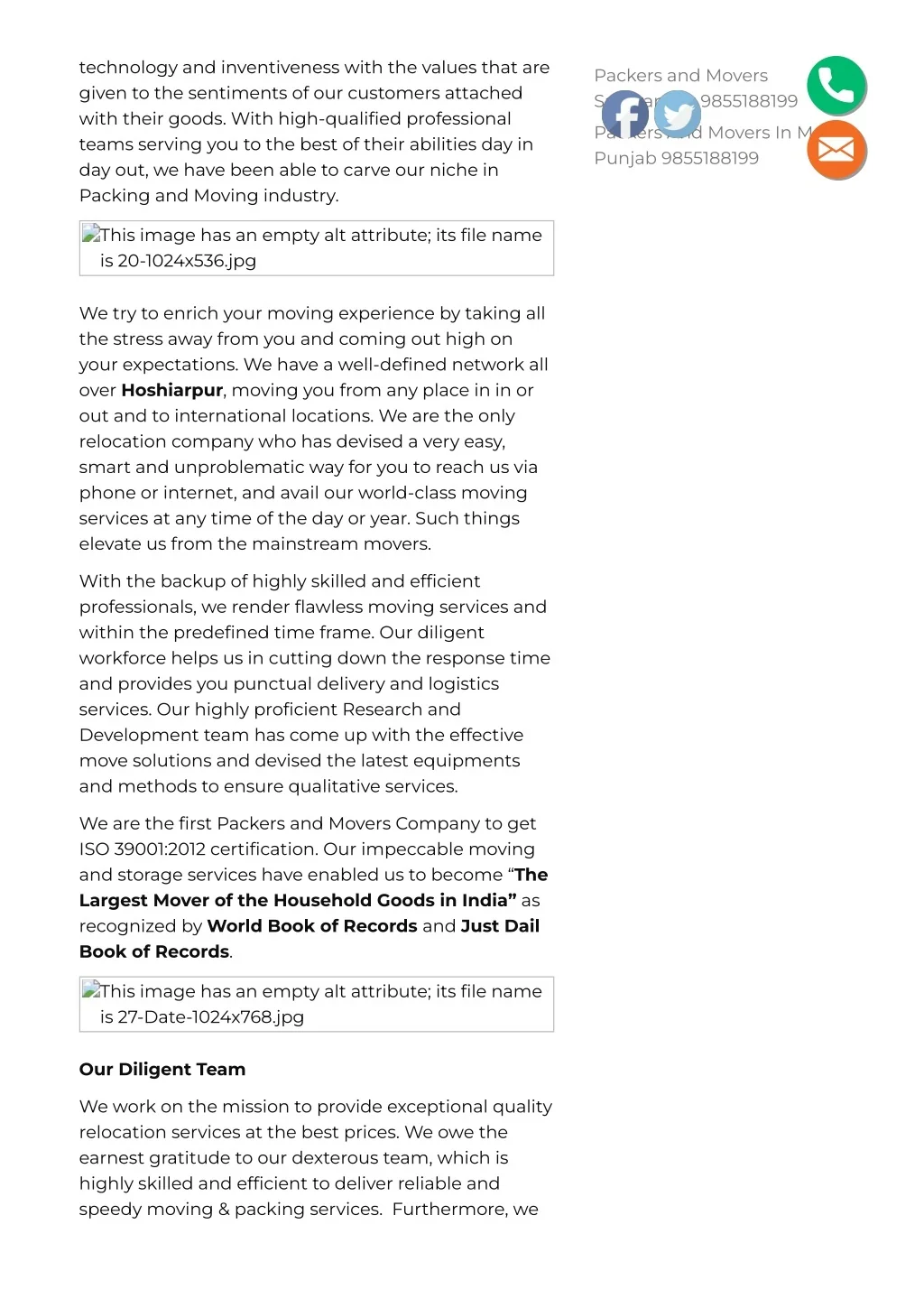 technology and inventiveness with the values that are given to the sentiments of our customers attached with their goods. With high-quali몭ed professional teams serving you to the best of their abilities day in day out, we have been able to carve our niche in Packing and Moving industry. Packers and Movers Saharanpur 9855188199 Packers And Movers In Mansa Punjab 9855188199 This image has an empty alt attribute; its 몭le name is 20-1024x536.jpg We try to enrich your moving experience by taking all the stress away from you and coming out high on your expectations. We have a well-de몭ned network all over Hoshiarpur, moving you from any place in in or out and to international locations. We are the only relocation company who has devised a very easy, smart and unproblematic way for you to reach us via phone or internet, and avail our world-class moving services at any time of the day or year. Such things elevate us from the mainstream movers. With the backup of highly skilled and ef몭cient professionals, we render 몭awless moving services and within the prede몭ned time frame. Our diligent workforce helps us in cutting down the response time and provides you punctual delivery and logistics services. Our highly pro몭cient Research and Development team has come up with the effective move solutions and devised the latest equipments and methods to ensure qualitative services. We are the 몭rst Packers and Movers Company to get ISO 39001:2012 certi몭cation. Our impeccable moving and storage services have enabled us to become “The Largest Mover of the Household Goods in India” as recognized by World Book of Records and Just Dail Book of Records. This image has an empty alt attribute; its 몭le name is 27-Date-1024x768.jpg Our Diligent Team We work on the mission to provide exceptional quality relocation services at the best prices. We owe the earnest gratitude to our dexterous team, which is highly skilled and ef몭cient to deliver reliable and speedy moving & packing services. Furthermore, we