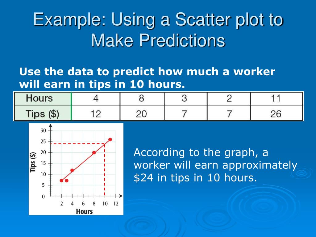 Example: Using a Scatter plot to Make Predictions Use the data to predict how much a worker will earn in tips in 10 hours. According to the graph, a worker will earn approximately $24 in tips in 10 hours.