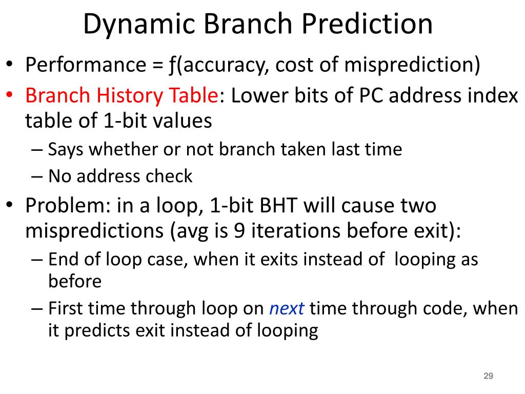 Dynamic Branch Prediction • Performance = ƒ(accuracy, cost of misprediction) • Branch History Table: Lower bits of PC address index table of 1-bit values • Says whether or not branch taken last time • No address check • Problem: in a loop, 1-bit BHT will cause two mispredictions (avg is 9 iterations before exit): • End of loop case, when it exits instead of looping as before • First time through loop on next time through code, when it predicts exit instead of looping