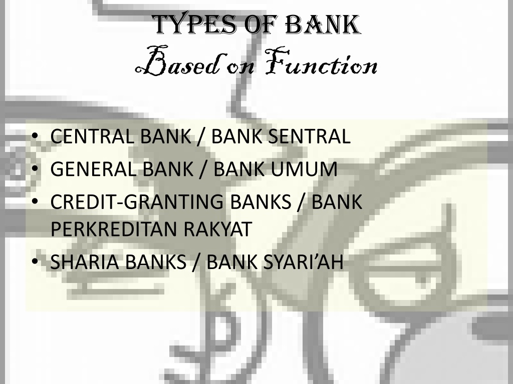 TYPES OF BANKBased on Function • CENTRAL BANK / BANK SENTRAL • GENERAL BANK / BANK UMUM • CREDIT-GRANTING BANKS / BANK PERKREDITAN RAKYAT • SHARIA BANKS / BANK SYARI’AH