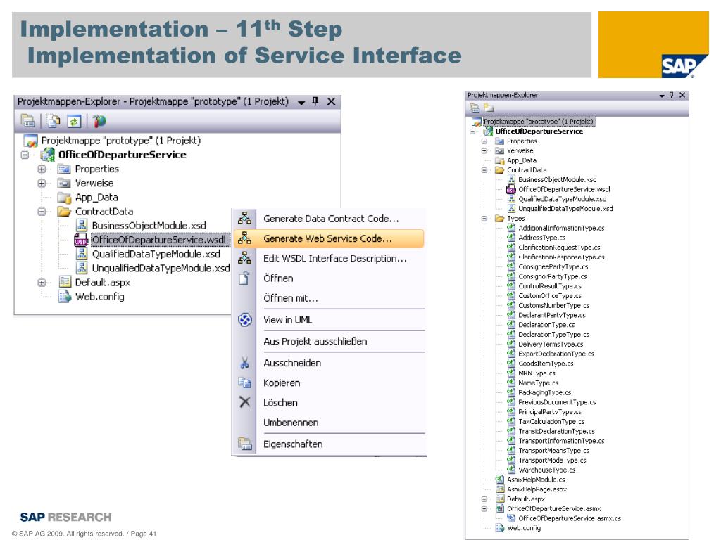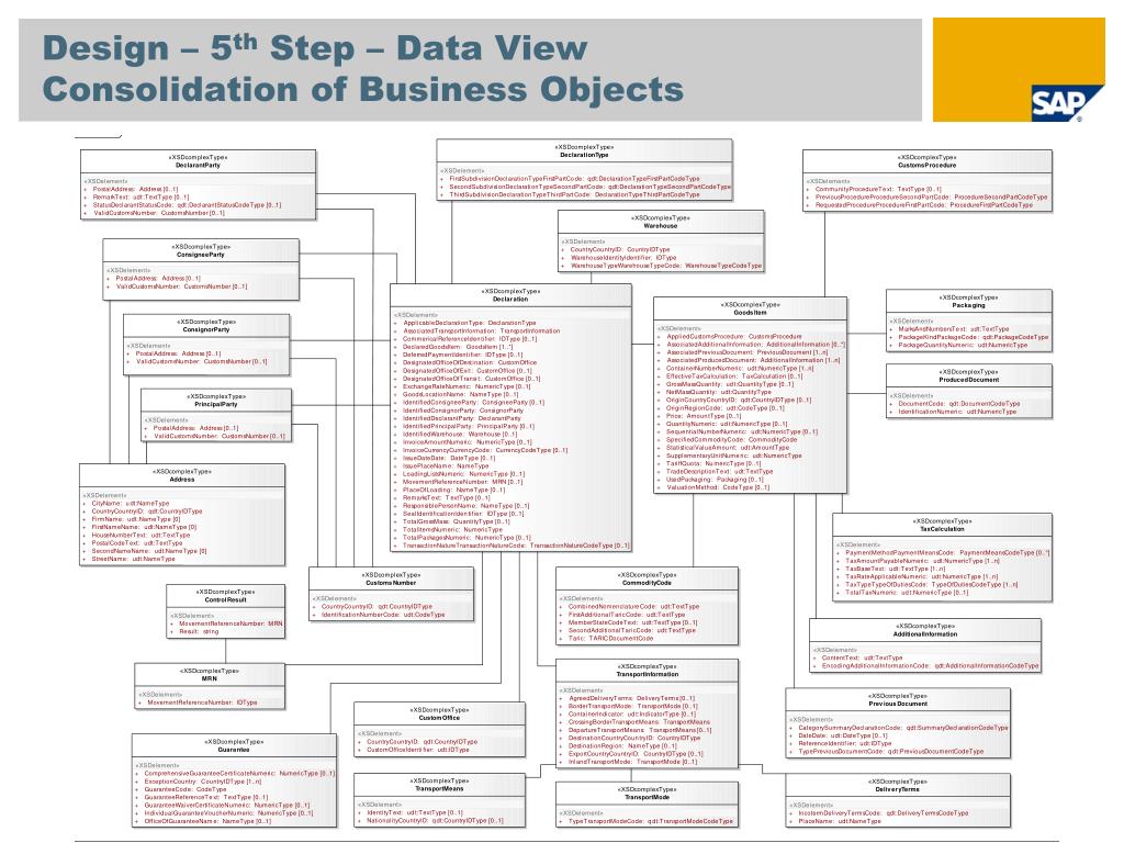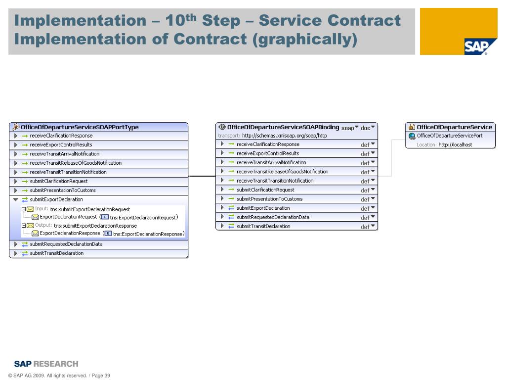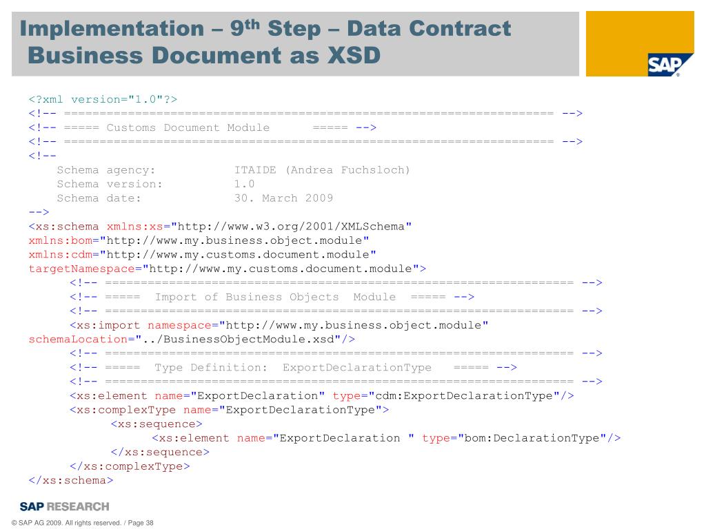 Implementation – 9th Step – Data Contract Business DocumentasXSD • <?xmlversion="1.0"?> • <!-- ===================================================================== --> • <!-- ===== CustomsDocument Module ===== --> • <!-- ===================================================================== --> • <!-- • Schema agency: ITAIDE (Andrea Fuchsloch) • Schema version: 1.0 • Schema date: 30. March 2009 • --> • <xs:schemaxmlns:xs="http://www.w3.org/2001/XMLSchema"xmlns:bom="http://www.my.business.object.module"xmlns:cdm="http://www.my.customs.document.module"targetNamespace="http://www.my.customs.document.module"> • <!-- ================================================================== --> • <!-- ===== Import of Business Objects Module ===== --> • <!-- ================================================================== --> • <xs:import namespace="http://www.my.business.object.module"schemaLocation="../BusinessObjectModule.xsd"/> • <!-- ================================================================== --> • <!-- ===== Type Definition: ExportDeclarationType ===== --> • <!-- ================================================================== --> • <xs:elementname="ExportDeclaration" type="cdm:ExportDeclarationType"/> • <xs:complexTypename="ExportDeclarationType"> • <xs:sequence> • <xs:elementname="ExportDeclaration" type="bom:DeclarationType"/> • </xs:sequence> • </xs:complexType> • </xs:schema>