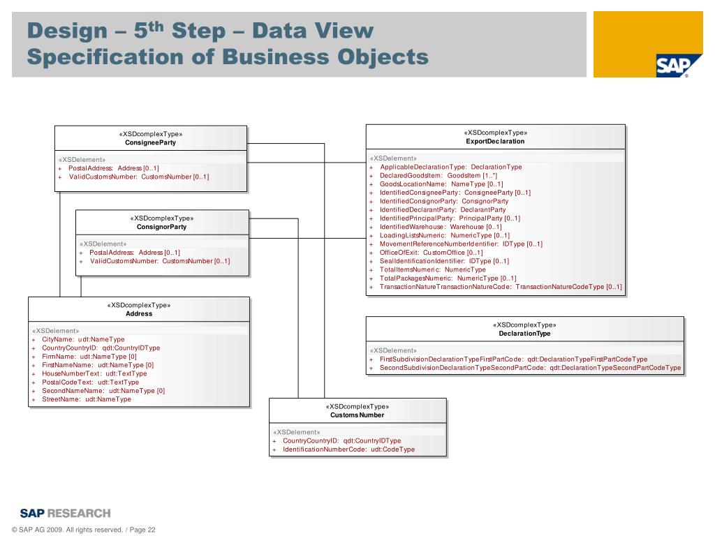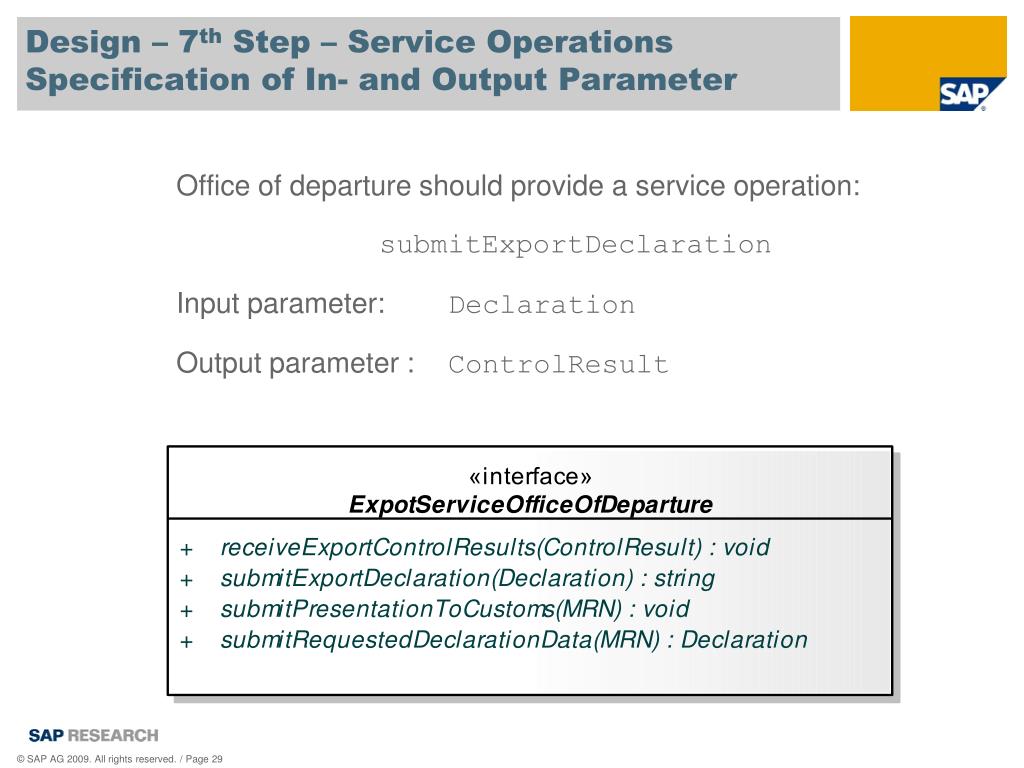 Design – 7th Step – Service OperationsSpecification of In- and Output Parameter • Office of departure should provide a service operation: • submitExportDeclaration • Input parameter: Declaration • Output parameter : ControlResult