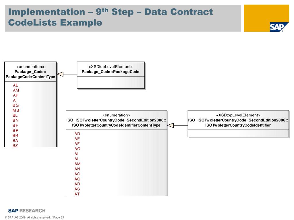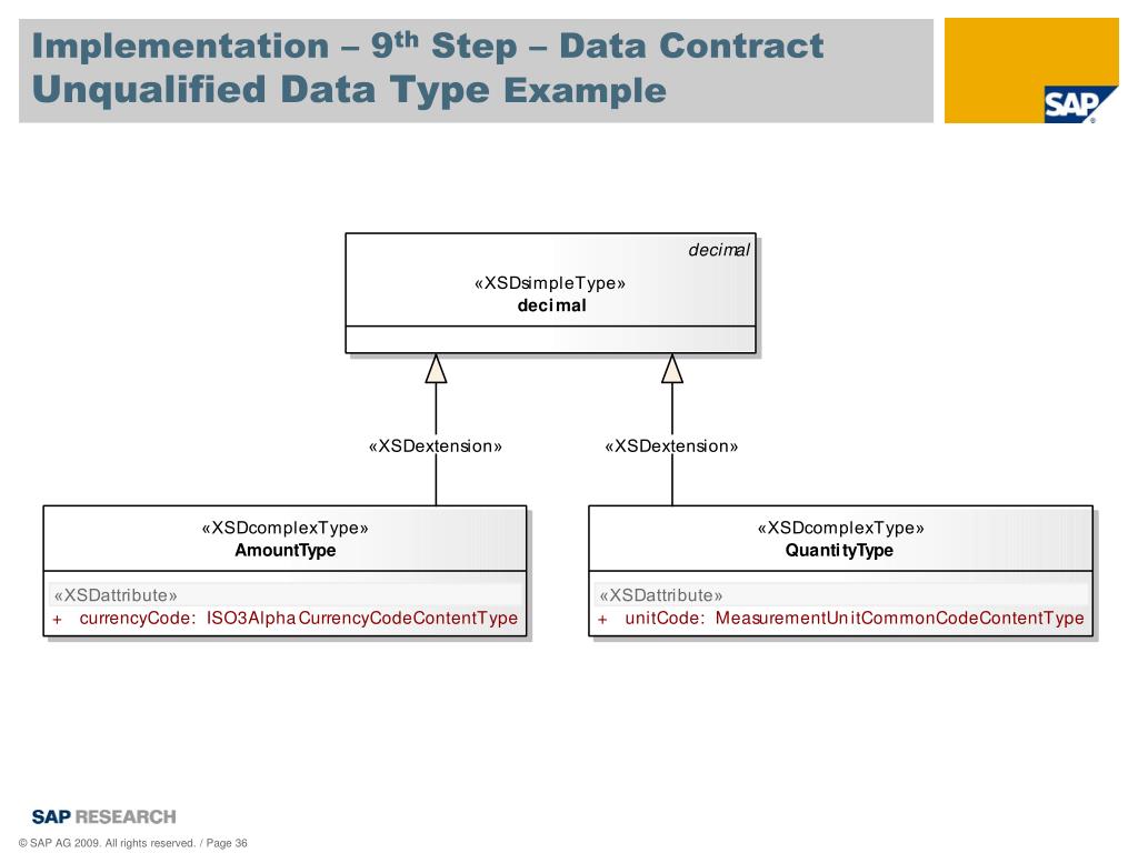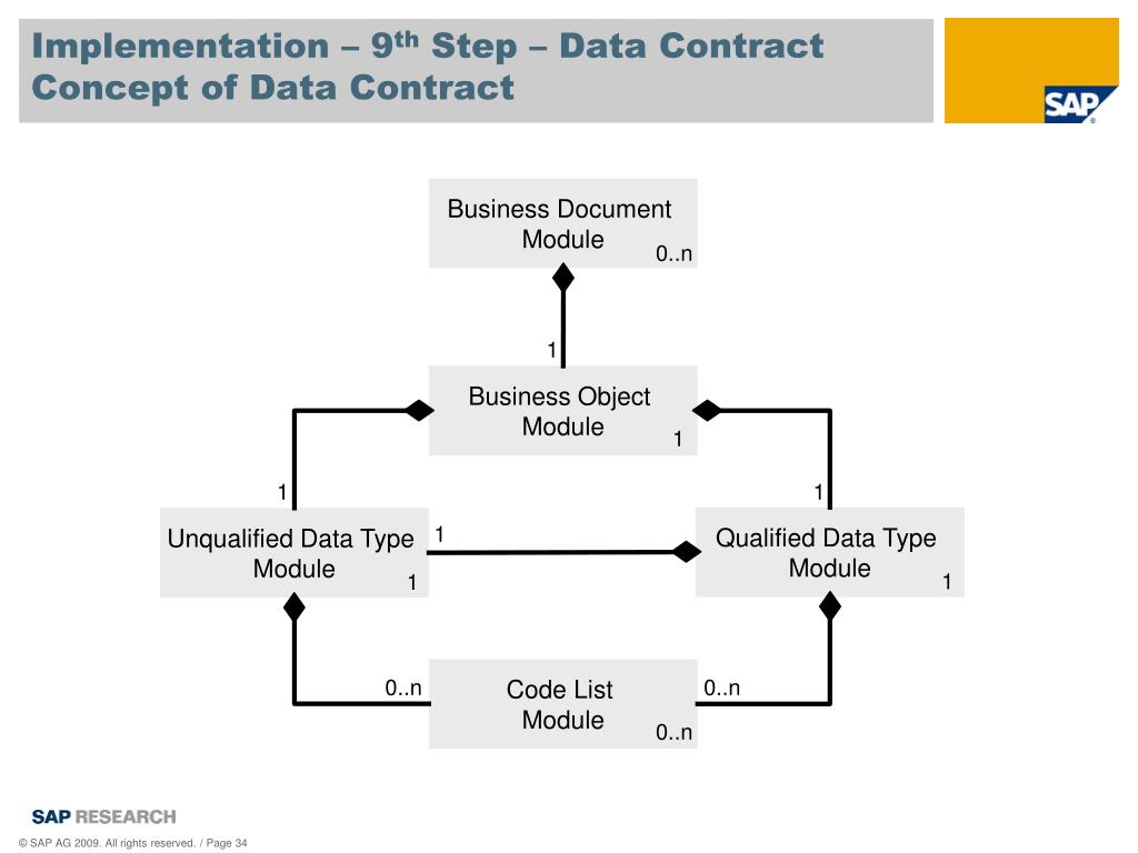 Implementation – 9th Step – Data ContractConceptof Data Contract Business DocumentModule 0..n 1 Business ObjectModule 1 1 1 Qualified Data Type Module Unqualified Data Type Module 1 1 1 Code List Module 0..n 0..n 0..n