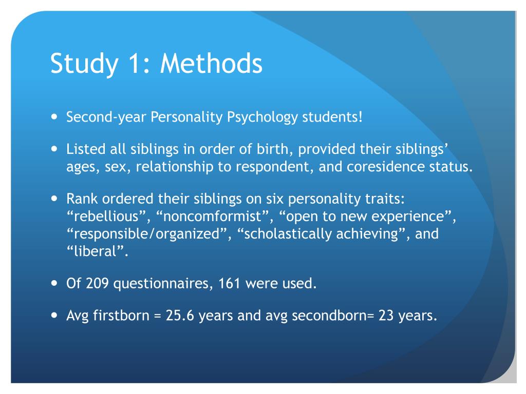Study 1: Methods • Second-year Personality Psychology students! • Listed all siblings in order of birth, provided their siblings’ ages, sex, relationship to respondent, and coresidence status. • Rank ordered their siblings on six personality traits: “rebellious”, “noncomformist”, “open to new experience”, “responsible/organized”, “scholastically achieving”, and “liberal”. • Of 209 questionnaires, 161 were used. • Avg firstborn = 25.6 years and avg secondborn= 23 years.