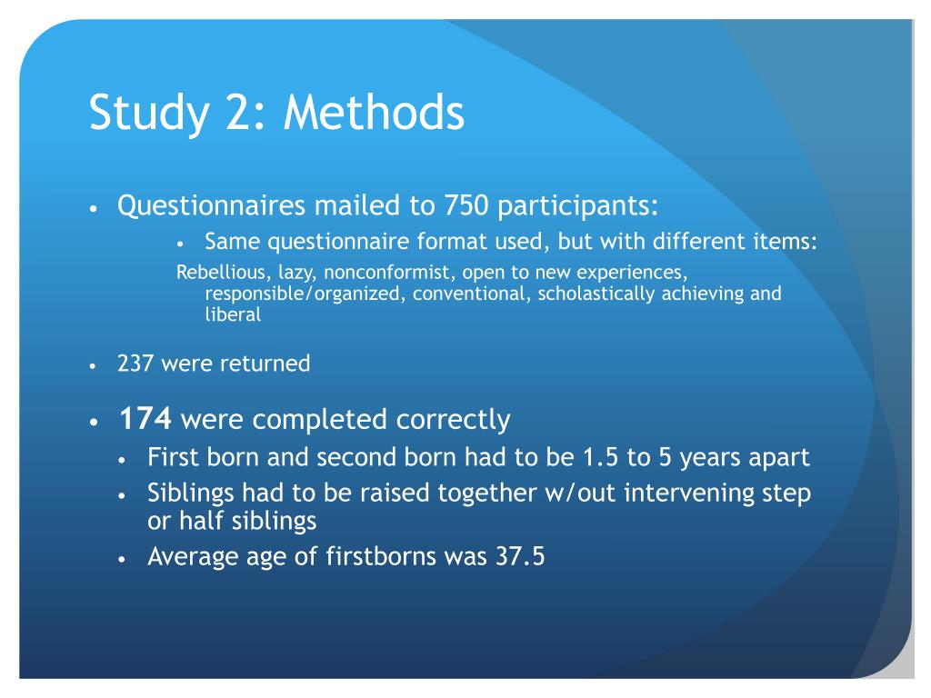 Study 2: Methods • Questionnaires mailed to 750 participants: • Same questionnaire format used, but with different items: Rebellious, lazy, nonconformist, open to new experiences, responsible/organized, conventional, scholastically achieving and liberal • 237 were returned • 174 were completed correctly • First born and second born had to be 1.5 to 5 years apart • Siblings had to be raised together w/out intervening step or half siblings • Average age of firstborns was 37.5