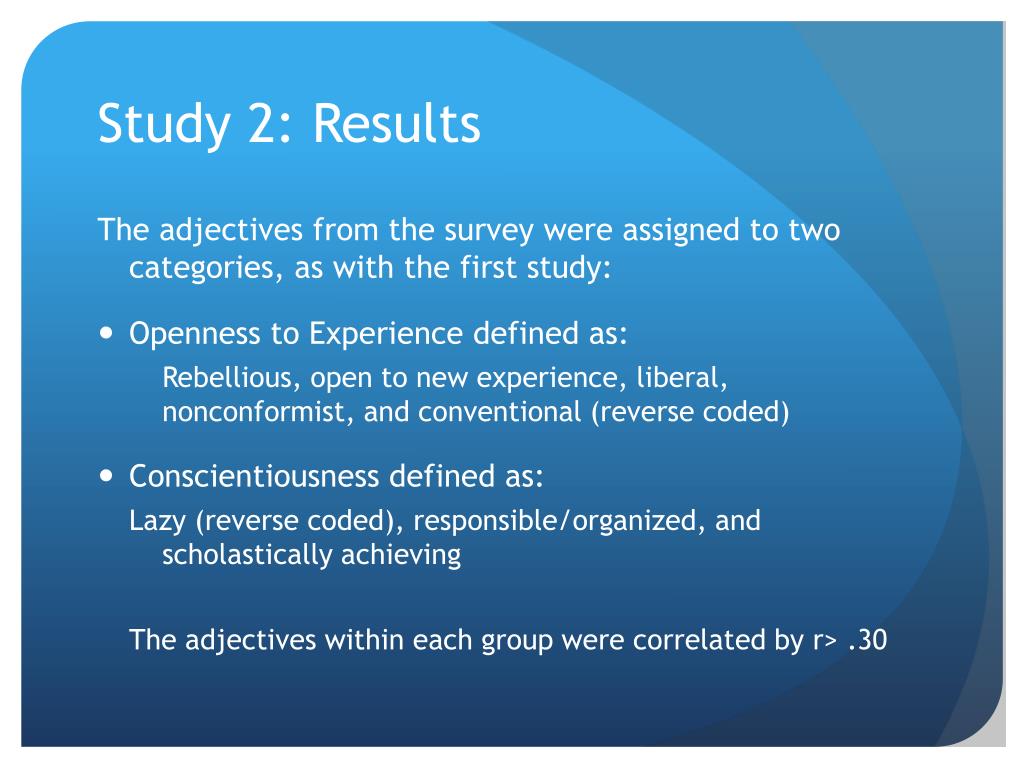 Study 2: Results The adjectives from the survey were assigned to two categories, as with the first study: • Openness to Experience defined as: Rebellious, open to new experience, liberal, nonconformist, and conventional (reverse coded) • Conscientiousness defined as: Lazy (reverse coded), responsible/organized, and scholastically achieving The adjectives within each group were correlated by r> .30