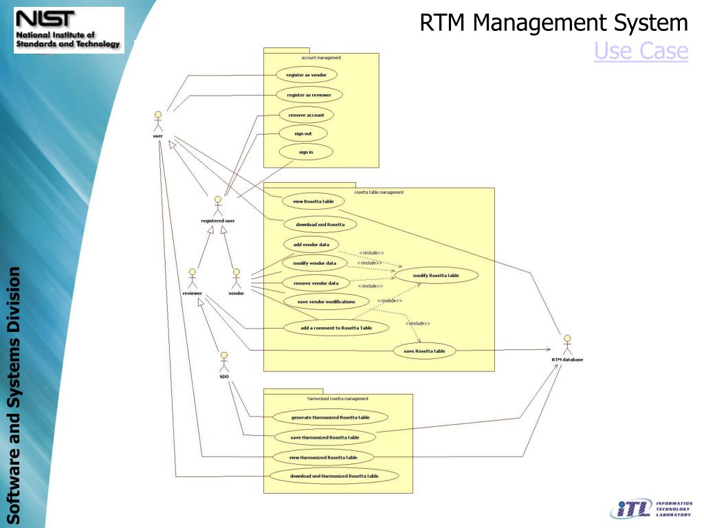 NIST Tooling To Support RTM Process Proposed “RTM Management Service” • The tool will be a web application to allow vendors and reviewers access, retrieval, and reporting of Rosetta Tables over the internet in conformance to RTM. • Addresses RTM requirement : “Any corrections or additions will be reflected back in the vendor’s table and a new version of the merged table (and XML files) will be created. • The tool will provide the capability of saving information in XML format as defined by RTM proposal • The tool will provide the capability to apply XSLT transformations specified by the RTM proposal to harmonize the tables • Merge individual vendor table(s) into a single table. • Provide a report identifying differences • RTM example: “Create a list of the MDC reference identifiers and the vendors that select it, and MDC identifiers that were selected by only a single vendor --would be examined and compared with similar terms”. • Provide a report identifying missing or new terms (no mapping). • RTM requirement: “Any missing or new MDC reference identifiers will be submitted to the appropriate standards group to create and add the new terms to the relevant standard”.