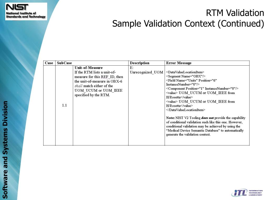 NIST V2 Testing Tools: PCD-01 and Rosetta relationship(RTM Validation at the Device/Gateway Message Level) NIST Testing Tool provides validation in the following areas (failure types): • VERSION*: The version in the message and in the profile should match. • MESSAGE_STRUCTURE_ID*: The message type (MSH.9 element) in the profile and in the message should match. • MESSAGE_STRUCTURE: The message should have a valid message structure (correct usage, correct cardinality, and correct element name). • USAGE: R elements should be present; X elements should not be present in the message. • CARDINALITY: Elements should be present at least the minimum times and at most the maximum times specified in the profile. It should also take into account the usage of the element (X element with a minimum of 4 should not be present in the message). • LENGTH: The value of the element should have a length equal or less than the value specified in the profile. • DATATYPE: For the datatype NM, DT, DTM, SI and TM, the value of the element should match the regular expression defined in the standard. • DATA: The value of the element should match a constant specified in the profile, a value set specified in a table, a value or a regular expression specified in the message validation context. • MESSAGE_VALIDATION_CONTEXT*: This is a user input error when the location specified in the message validation context can't be found in the message. • TABLE_NOT_FOUND*: This is a user input when a table can't be found in the table files (TableProfileDocument). • AMBIGUOUS_PROFILE*: The profile should not be ambiguous.