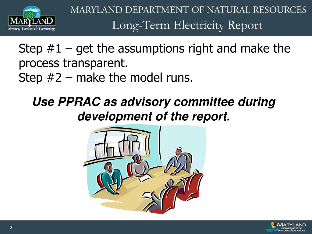 Step #1 – get the assumptions right and make the process transparent.Step #2 – make the model runs. Use PPRAC as advisory committee during development of the report.