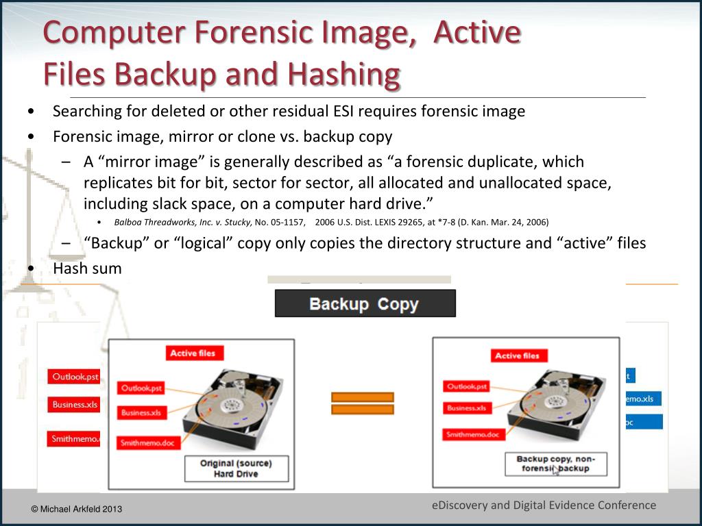 Computer Forensic Image, Active Files Backup and Hashing • Searching for deleted or other residual ESI requires forensic image • Forensic image, mirror or clone vs. backup copy • A “mirror image” is generally described as “a forensic duplicate, which replicates bit for bit, sector for sector, all allocated and unallocated space, including slack space, on a computer hard drive.” • Balboa Threadworks, Inc. v. Stucky, No. 05-1157, 2006 U.S. Dist. LEXIS 29265, at *7-8 (D. Kan. Mar. 24, 2006) • “Backup” or “logical” copy only copies the directory structure and “active” files • Hash sum Forensic copy