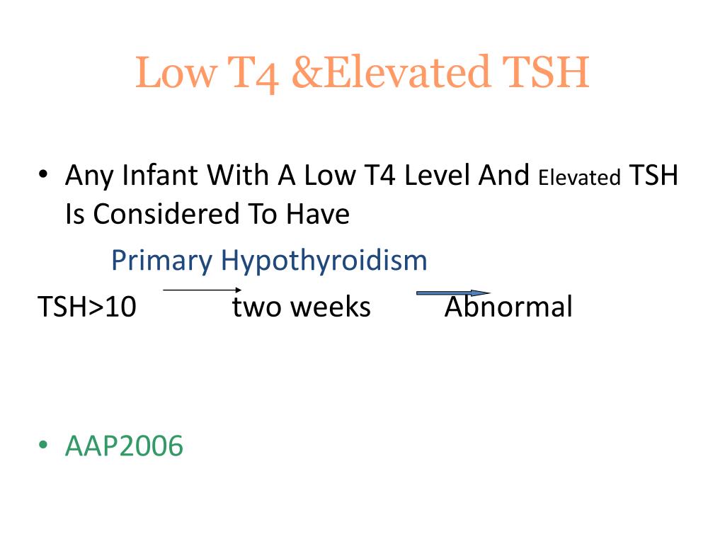 Low T4 &Elevated TSH • Any Infant With A Low T4 Level And Elevated TSH Is Considered To Have Primary Hypothyroidism TSH>10 two weeks Abnormal • AAP2006