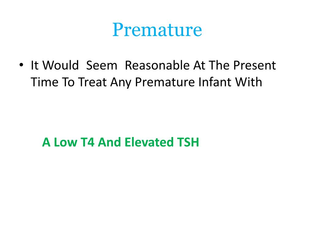 Premature • Currently the evidence base does not indicate cognitive benefit from thyroid therapy of hypothyroxinemia of prematurity in the absence of TSH elevation. • AAP2006