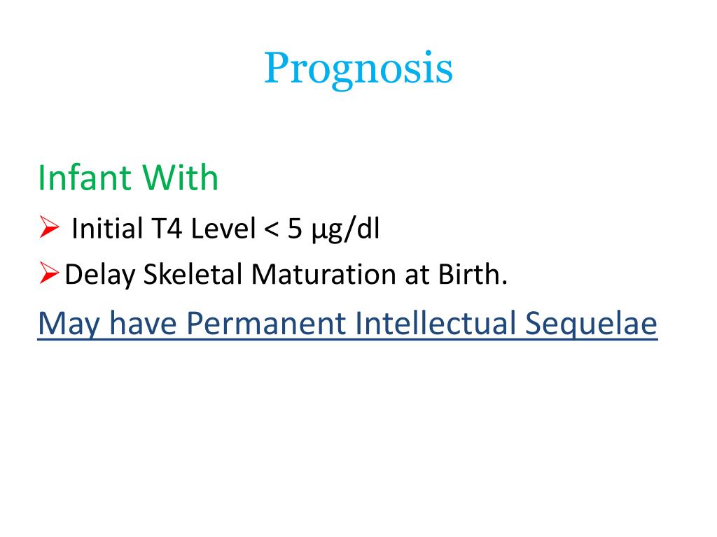 Prognosis Infant With • Initial T4 Level < 5 µg/dl • Delay Skeletal Maturation at Birth. May have Permanent Intellectual Sequelae