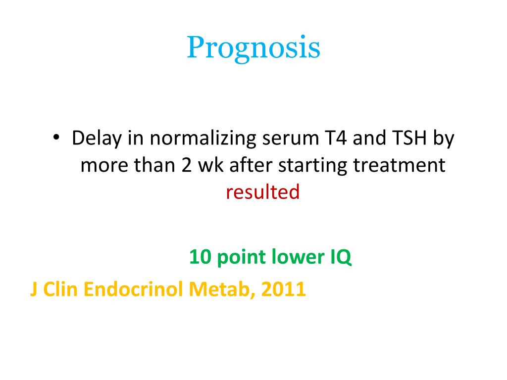 prognosis • T4 <10 ug/dl in the first year of life was associated with an 18-point lower IQ compared with T4 above 10u g/d • J ClinEndocrinolMetab, 2011