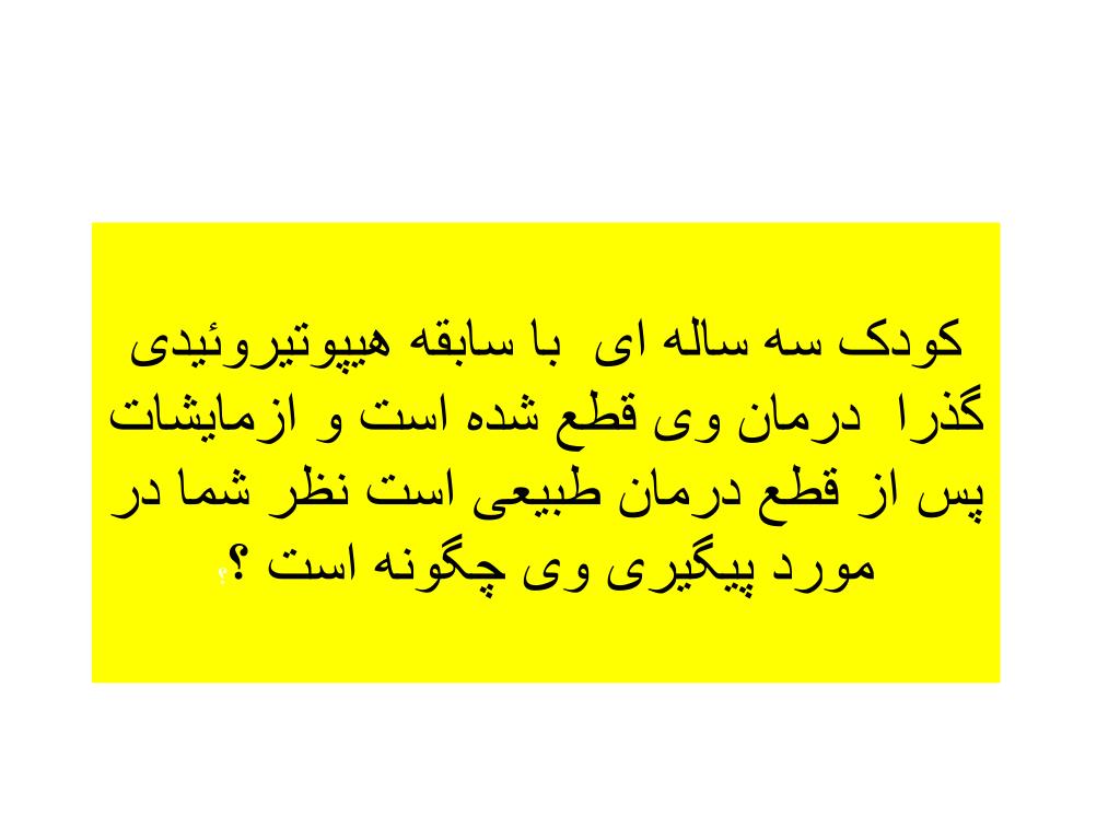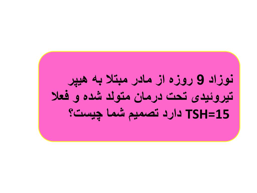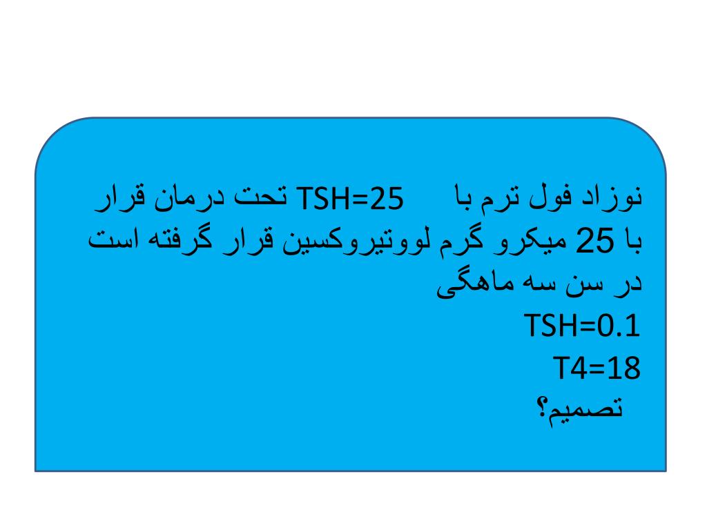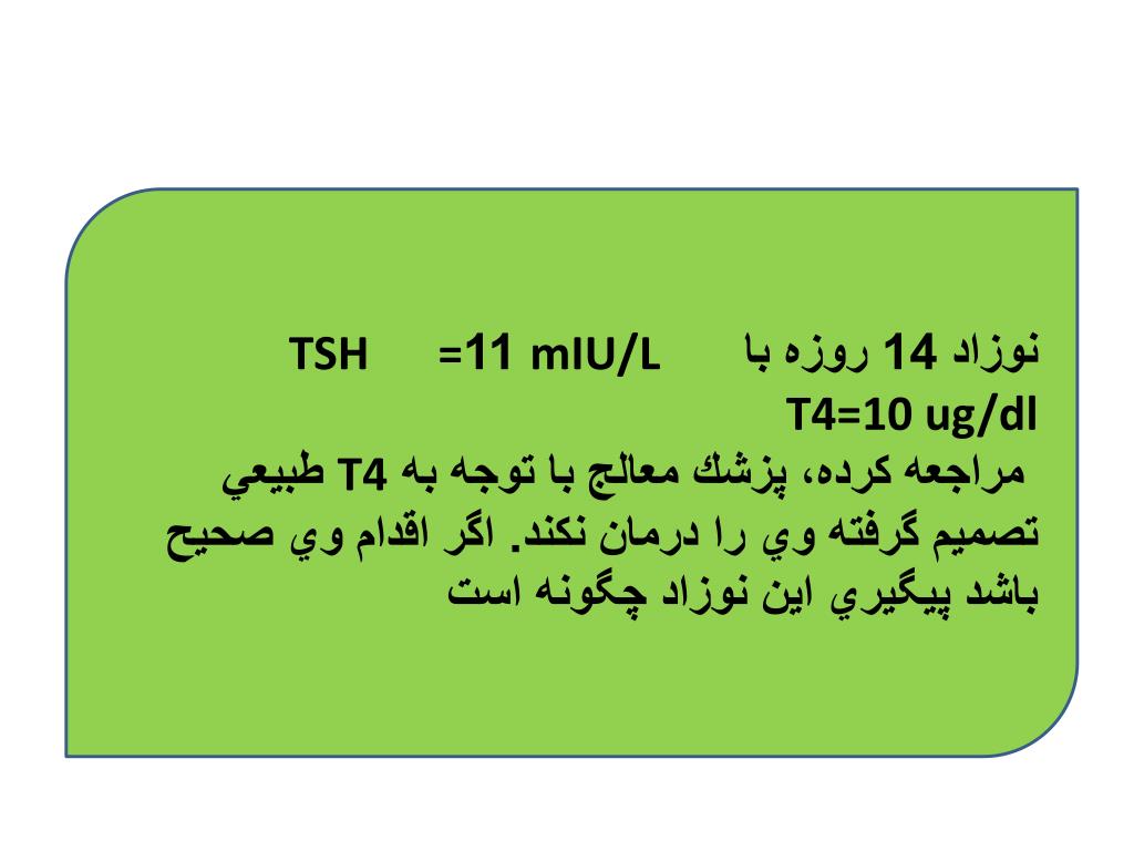 نوزاد 14 روزه با وزن 1300 گرم • T4= 4 µg/dl TSH=8mu/L • با توجه به T4 پائين و TSH بالا پزشك معالج تشخيص هيپوتيروئيدي داد. نظر شما چيست؟