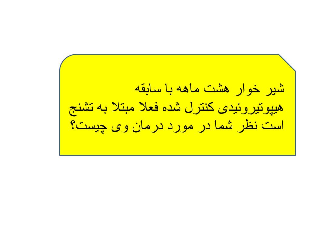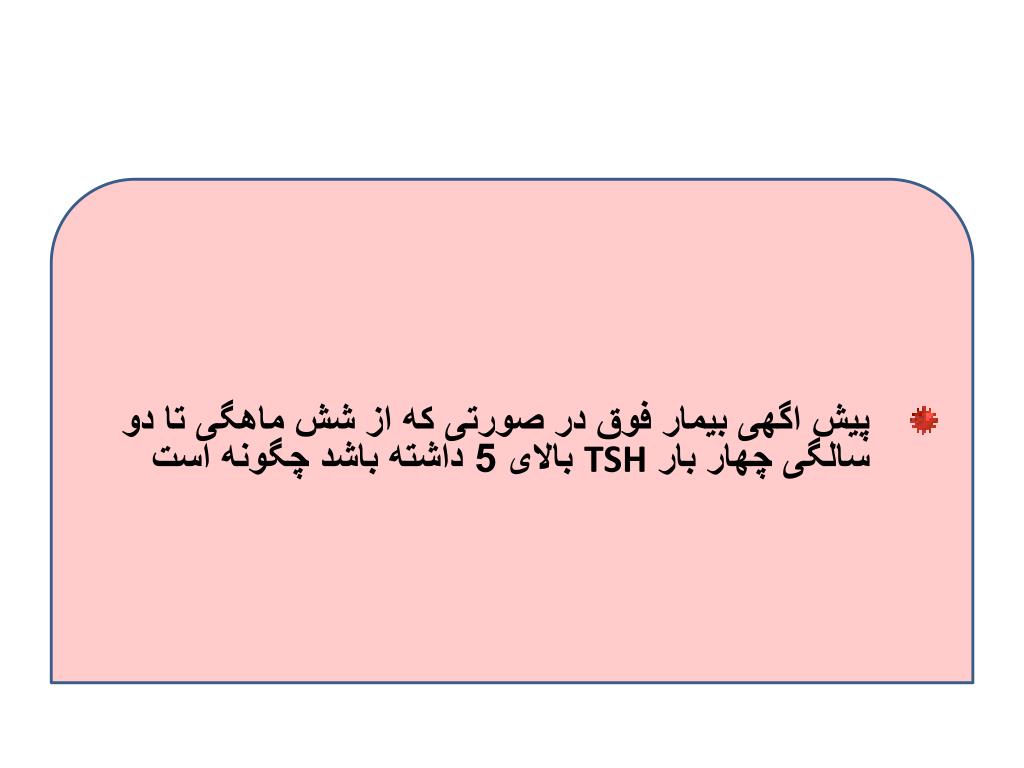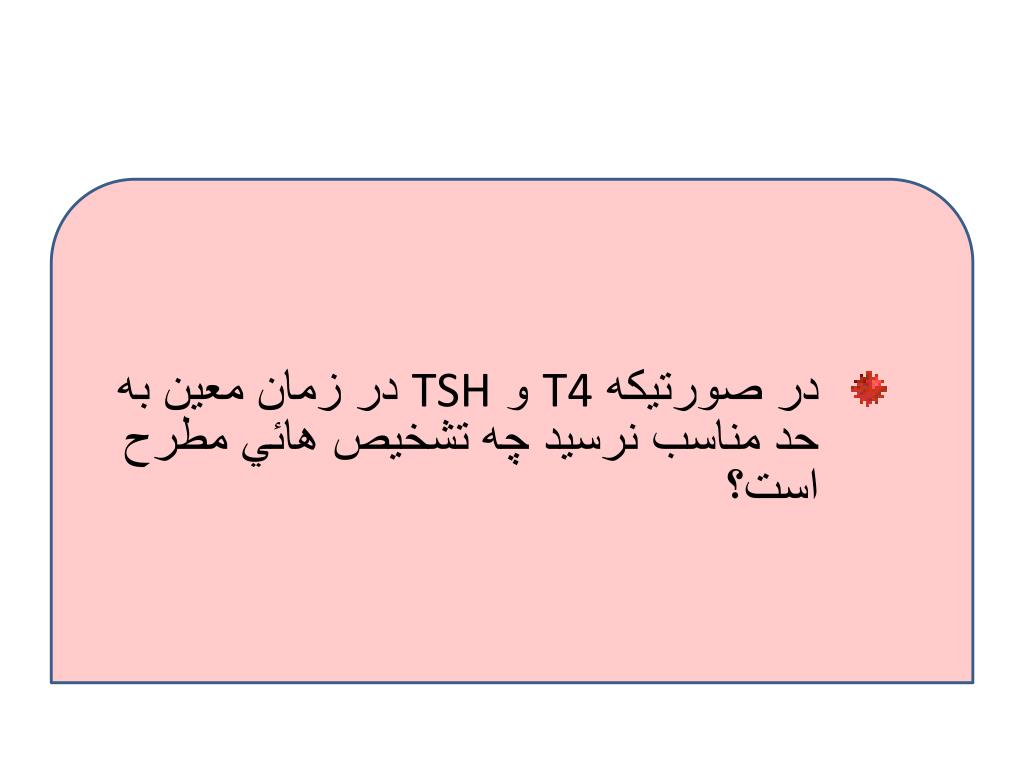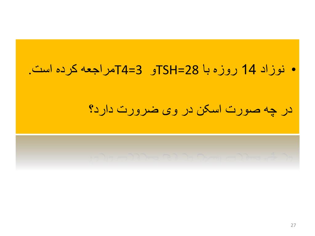 نوزاد 14 روزه با وزن 1300 گرم • T4= 4 µg/dl TSH=8mu/L • با توجه به T4 پائين و TSH بالا پزشك معالج تشخيص هيپوتيروئيدي داد. نظر شما چيست؟