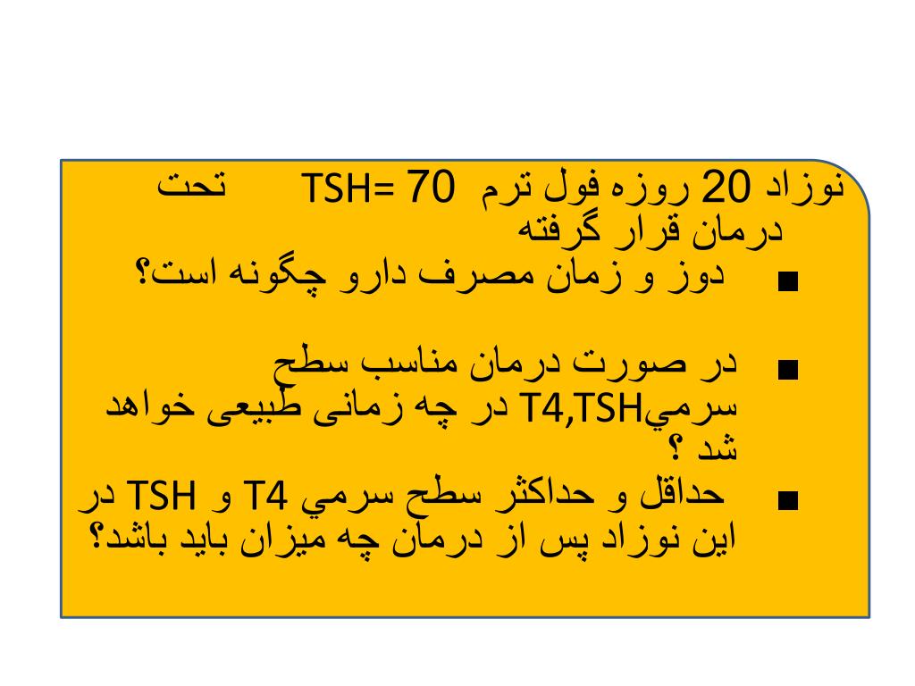 نوزاد 20 روزه فول ترم 70TSH= تحت درمان قرار گرفته • دوز و زمان مصرف دارو چگونه است؟ • در صورت درمان مناسب سطح سرميT4,TSH در چه زمانی طبیعی خواهد شد ؟ • حداقل و حداكثر سطح سرمي T4 و TSH در اين نوزاد پس از درمان چه میزان باید باشد؟