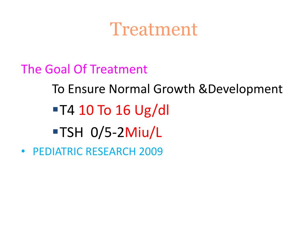 Treatment The Goal Of Treatment To Ensure Normal Growth &Development • T4 10 To 16 Ug/dl • TSH 0/5-2Miu/L • PEDIATRIC RESEARCH 2009