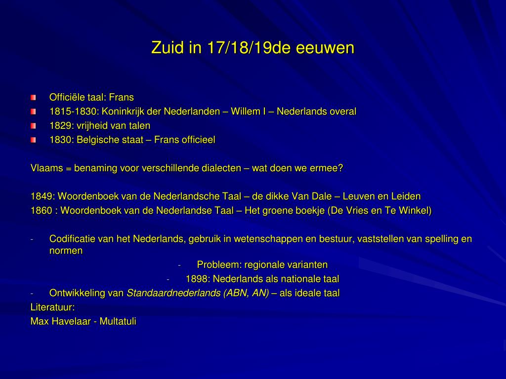 Zuid in 17/18/19de eeuwen • Officiële taal: Frans • 1815-1830: Koninkrijk der Nederlanden – Willem I – Nederlands overal • 1829: vrijheid van talen • 1830: Belgische staat – Frans officieel Vlaams = benaming voor verschillende dialecten – wat doen we ermee? 1849: Woordenboek van de Nederlandsche Taal – de dikke Van Dale – Leuven en Leiden 1860 : Woordenboek van de Nederlandse Taal – Het groene boekje (De Vries en Te Winkel) • Codificatie van het Nederlands, gebruik in wetenschappen en bestuur, vaststellen van spelling en normen • Probleem: regionale varianten • 1898: Nederlands als nationale taal • Ontwikkeling van Standaardnederlands (ABN, AN) – als ideale taal Literatuur: Max Havelaar - Multatuli