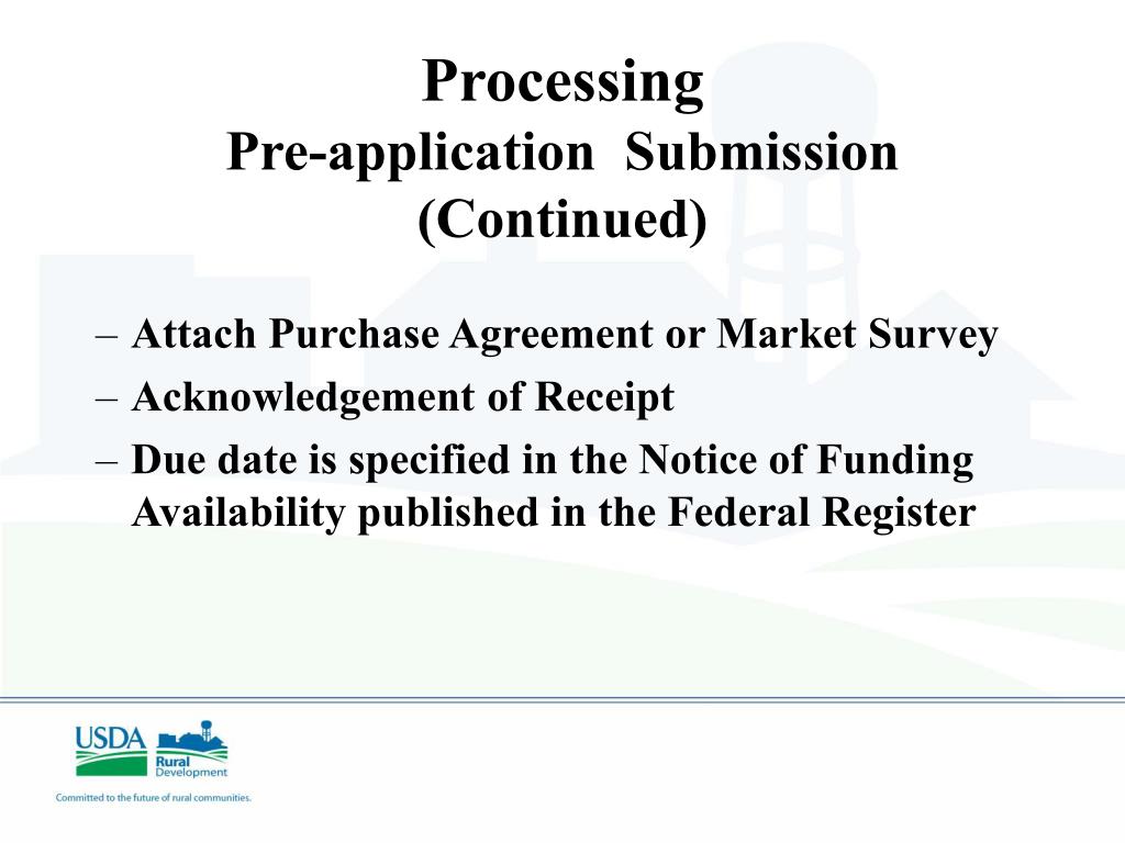 ProcessingPre-application Submission (Continued) • Attach Purchase Agreement or Market Survey • Acknowledgement of Receipt • Due date is specified in the Notice of Funding Availability published in the Federal Register