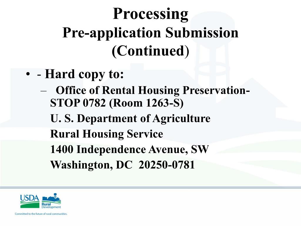 ProcessingPre-application Submission (Continued) • - Hard copy to: • Office of Rental Housing Preservation-STOP 0782 (Room 1263-S) U. S. Department of Agriculture Rural Housing Service 1400 Independence Avenue, SW Washington, DC 20250-0781