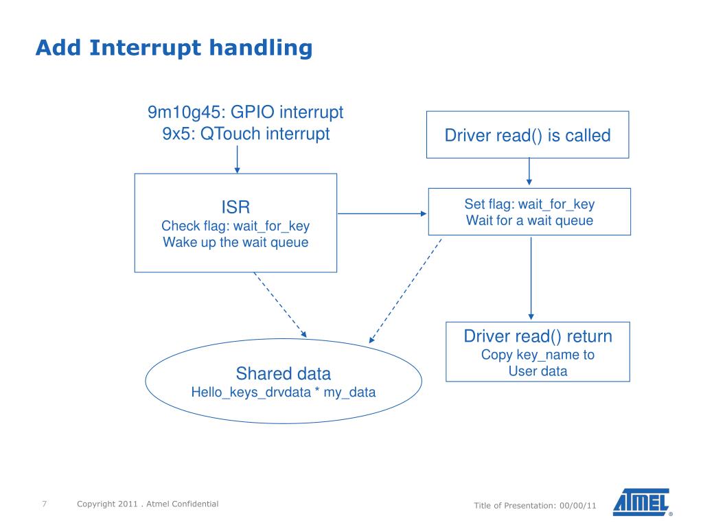 Add Interrupt handling 9m10g45: GPIO interrupt Driver read() is called 9x5: QTouch interrupt ISR Check flag: wait_for_key Wake up the wait queue Set flag: wait_for_key Wait for a wait queue Driver read() return Copy key_name to User data Shared data Hello_keys_drvdata * my_data